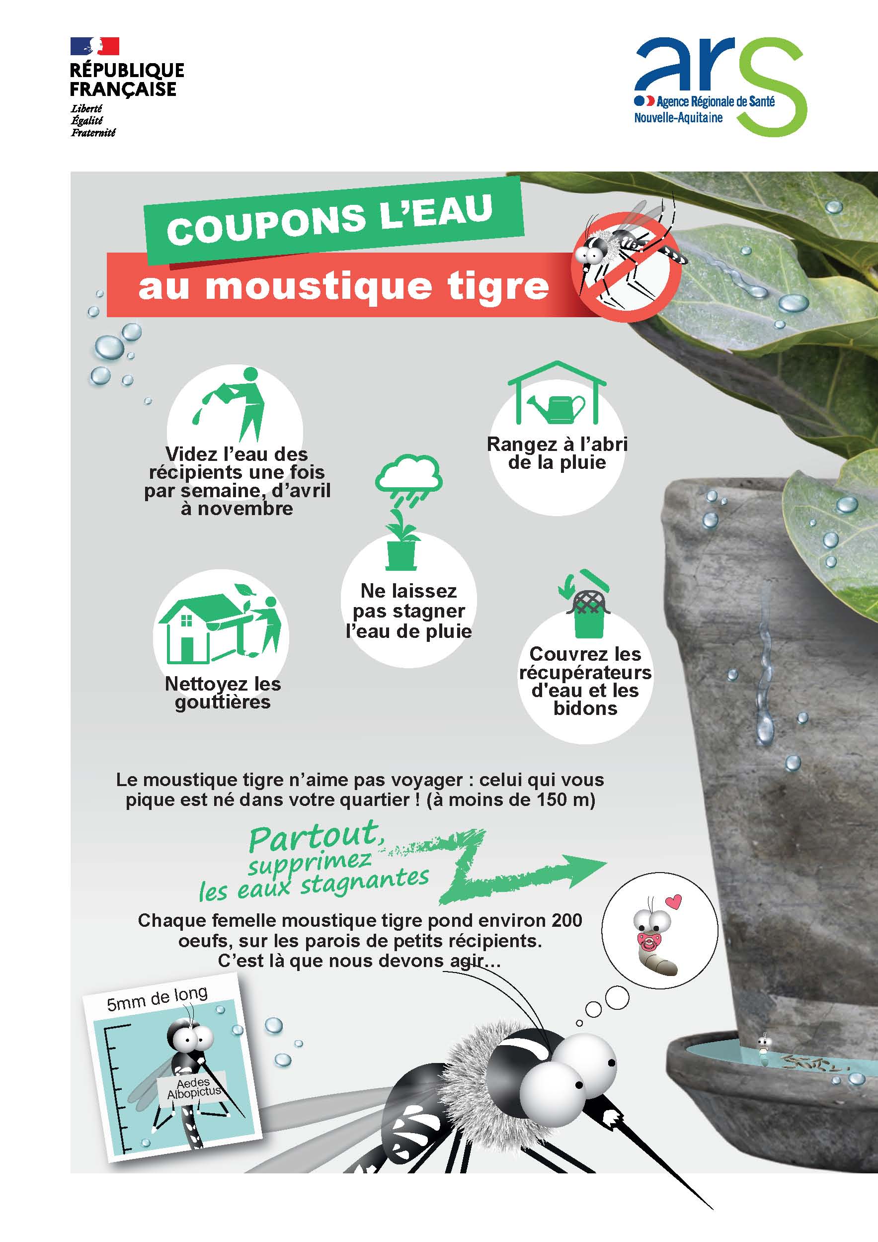 Chaque femelle moustique tigre pond environ 200 œufs. Au contact de l’eau (même en petites quantités), ils donnent des larves. C’est là qu’il faut agir. Le moustique tigre est urbain. Il se déplace peu : il vit dans un rayon de 150 m… le moustique qui vous pique est donc né dans votre quartier ! Si l’ensemble du voisinage applique les bons gestes, c ’est tout le quartier qui peut espérer un été tranquille !