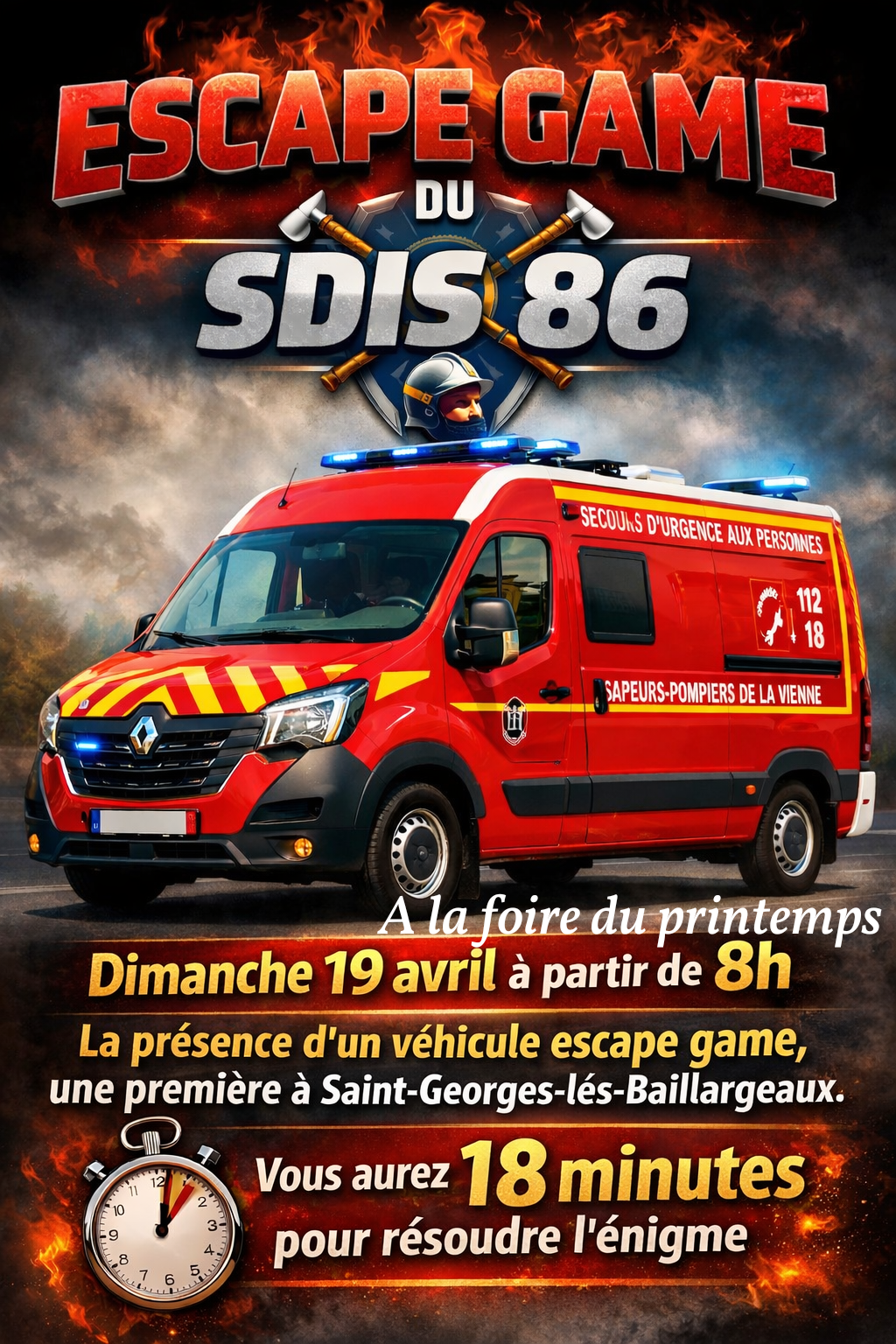 Mosaïque Animation ESCAPE GAME SDIS Partager Le SDIS vous invite à résoudre l'énigme de leur escape game... vous avez 18 minutes pour sortir du véhicule ! 19 avr. 2026 29 avr. 2026 De 8h00 à 18h00 Vous pourrez les retrouver à la foire du printemps à Saint Georges lès Baillargeaux.