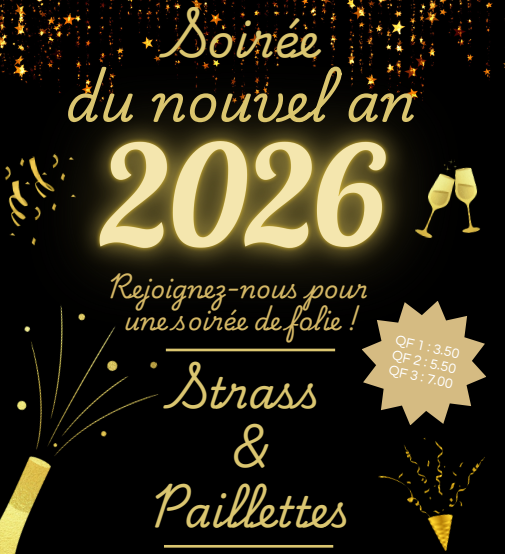 Mosaïque Jeunesse Soirée Nouvel An 2026 Partager L'accueil jeune de Dissay propose une soirée de folie pour fêter le début de l'année 2026 ! 16 jan. 2026 De 18h00 à 22h30 Le thème du jour : Strass et paillettes ! Infos réservation Réservation obligatoire sur INOE Tarifs QF1 - 3,50 € / QF2 -5,50 € / QF 3 - 7€